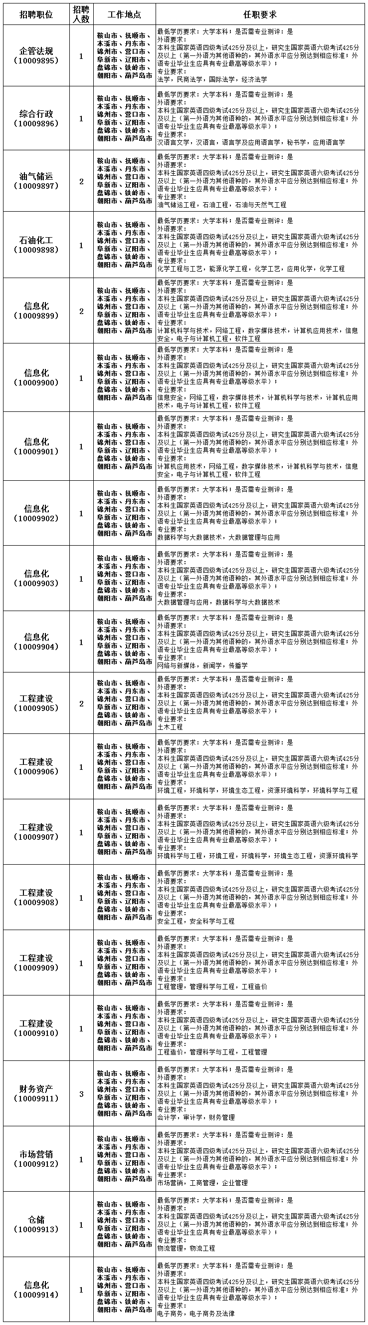 5.毕业生工作地点为鞍山、抚顺、本溪、丹东、锦州、营口、阜新、辽阳、铁岭、朝阳、盘锦、葫芦岛12个分公司所在地的加油站或油库岗位工作。