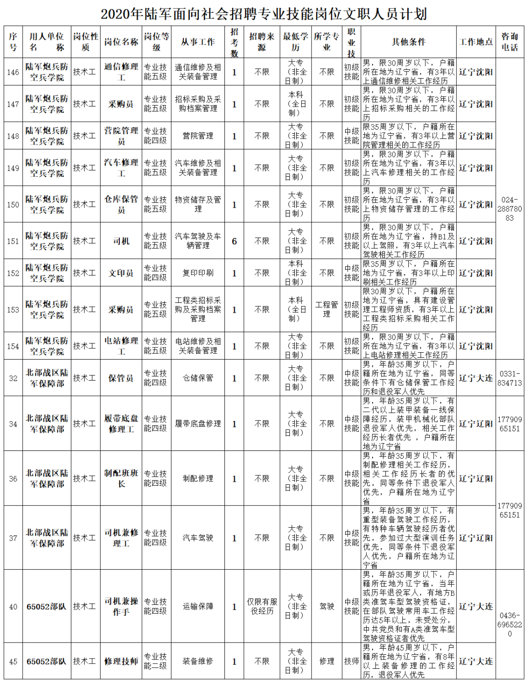附:陆军2020年度面向社会招聘技能岗位文职人员计划(辽宁招聘职位见下图)