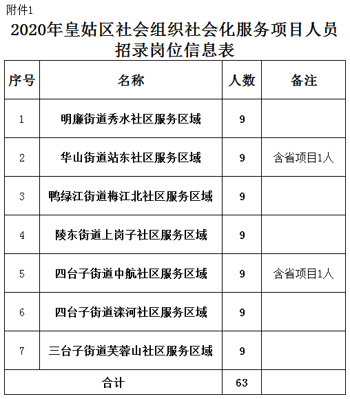 根据《市民政局关于印发沈阳市社区运行和服务机制创新试点工作实施方案(试行)的通知》(沈民办发[2020]4号)文件精神,依据工作需要,引入社会组织社会化服务项目人员70人。经批准,皇姑区委托社会组织拟面向社会公开招聘社会化服务项目人员63人(另外7人由专业机构提供心理咨询师),现将相关事项公告如下: