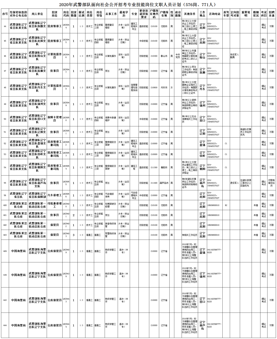附:2020年武警部队面向社会招聘专业技能岗位文职人员计划(辽宁地区岗位信息见下图)