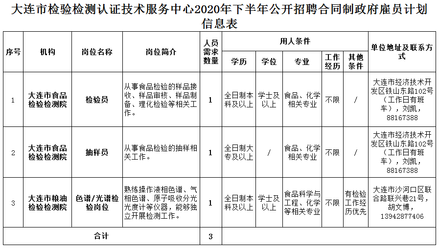 大连市检验检测认证技术服务中心是集检验检测、认证为一体,为政府制定检验检测认证政策法规和风险管理提供基础研究和技术支撑的市政府直属公益性事业单位。下设大连市食品检验检测院、大连市粮油检验检测院等分支机构。现根据工作需要,面向社会公开招聘3名合同制政府雇员,现将有关事项公告如下:
