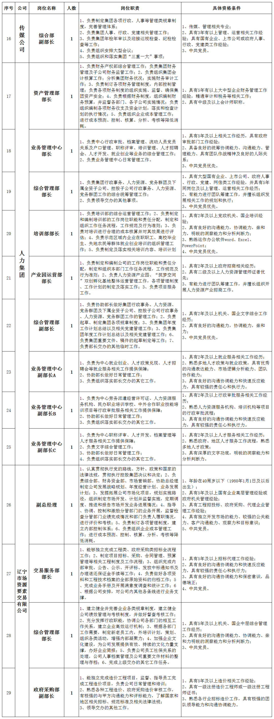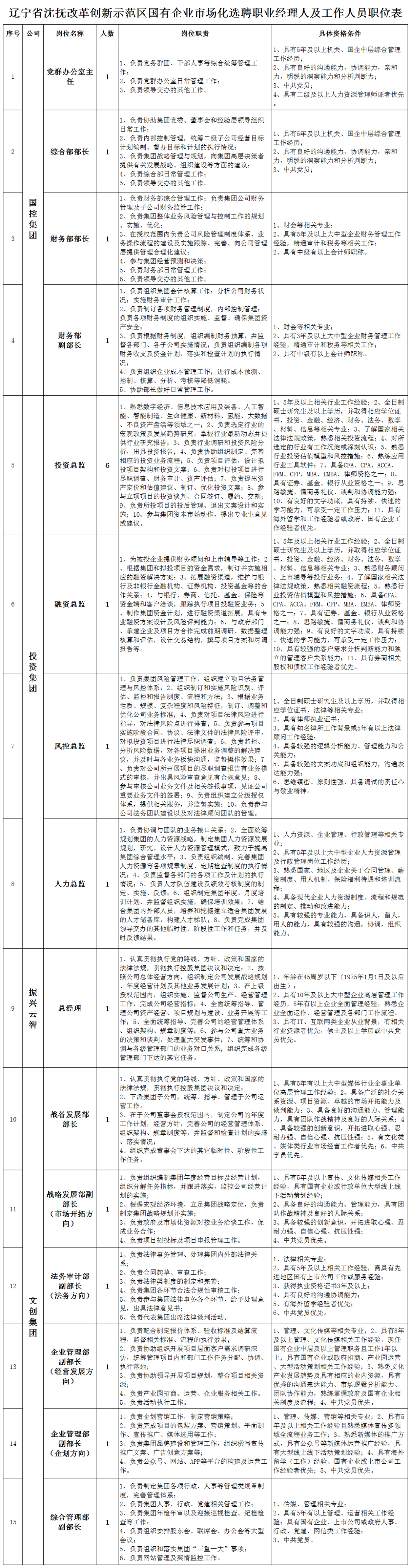 1.选聘岗位及数量。本次公开选聘示范区国有企业职业经理人及工作人员34人,其中国控集团4人、投资集团9人、振兴云智公司1人、文创集团6人、传媒公司1人、人力集团9人、辽宁资源要素公司4人。