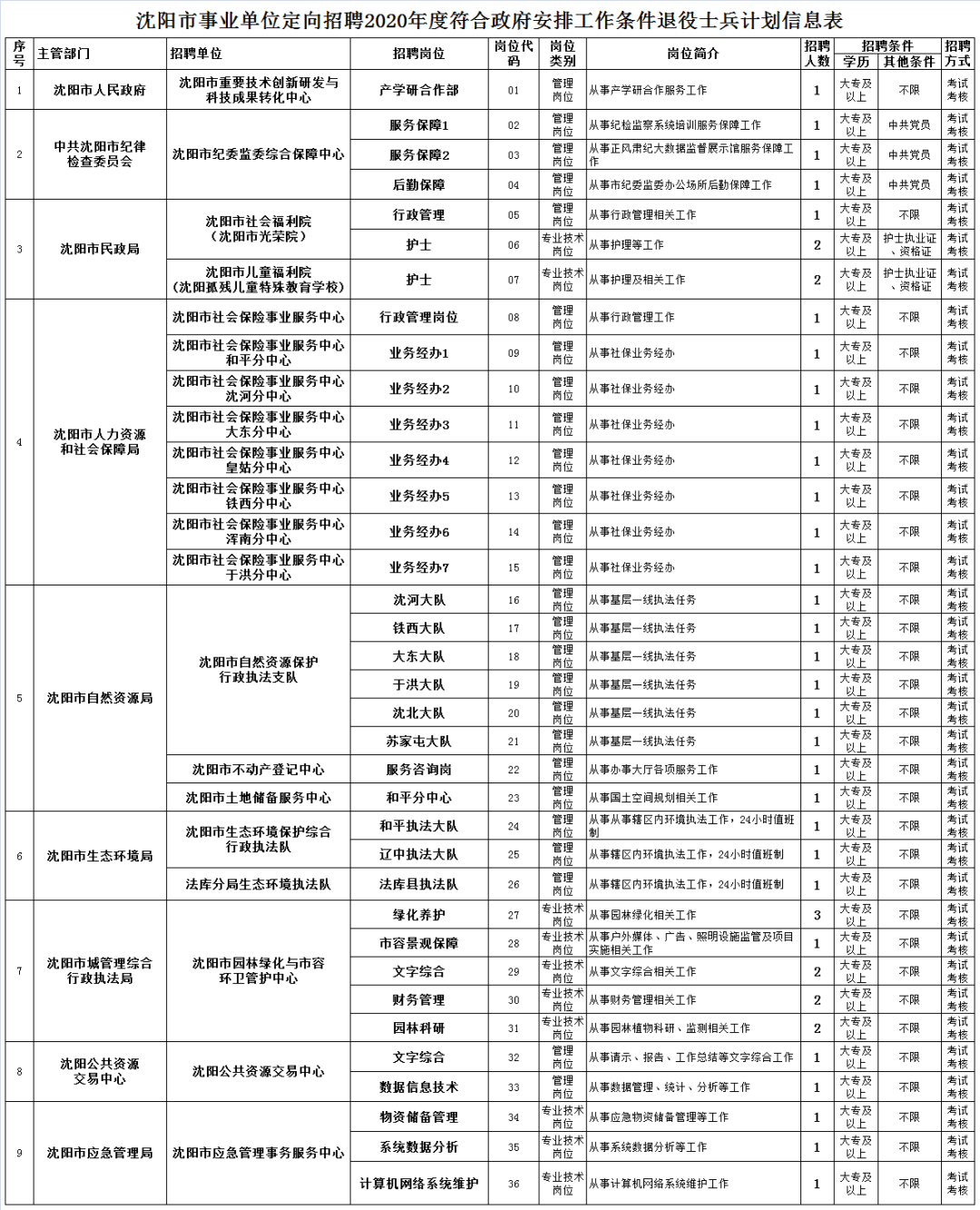 根据《事业单位人事管理条例》(国务院令第652号)、《中共辽宁省委组织部、辽宁省人事厅关于印发<辽宁省事业单位公开招聘人员办法>的通知》(辽人发〔2007〕1号)、《退役士兵安置条例》等政策规定,为切实做好我市年度符合政府安排工作条件退役士兵安置工作,经沈阳市退役军人事务领导小组批准,拟面向2020年度符合政府安排工作条件退役士兵开展定向招聘。现将有关事项公告如下: