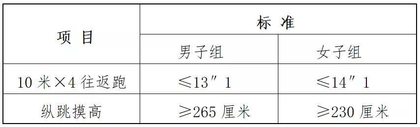测试方法为:准备测试阶段,受测者双脚自然分开,呈站立姿势。接到指令后,受测者屈腿半蹲,双臂尽力后摆,然后向前上方快速摆臂,双腿同时发力,尽力垂直向上起跳,同时单手举起触摸固定的高度线或高度标识,触摸到高度线或者高度标识的视为合格。测试不超过三次。