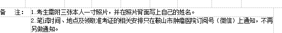 (2)笔试时间、地点及领取准考证:在鞍山市肿瘤医院订阅号(微信)上另行通知。