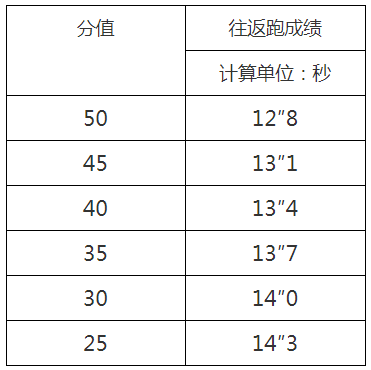 1、体能测试项目为10米*4往返跑、立定跳远两项,满分100分,占总成绩50%。体能测试标准为: