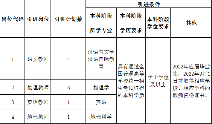 7.具有相应或以上学段、相应学科的教师资格证书,并在2022年9月1日前取得教师资格证书。特殊情况:新引进人员若未取得教师资格证书的,根据《人力资源社会保障部办公厅 教育部公办厅关于做好2022年中小学幼儿园教师公开招聘工作的通知》(人社厅发〔2022〕21号)要求,对于2021年及2022年中小学(含幼儿园、中等职业学校)教师资格考试中受疫情影响考生(2021年及2022年中小学教师资格证考试(NTCE)笔试成绩单或面试成绩单“受到疫情影响”栏标注为“是”),可以参加教师招聘。通过教师招聘的可以先上岗从事辅助性教育教学工作,再参加考试并取得教师资格。在1年试用期内未取得相应教师资格的,应当依法解除聘用合同。