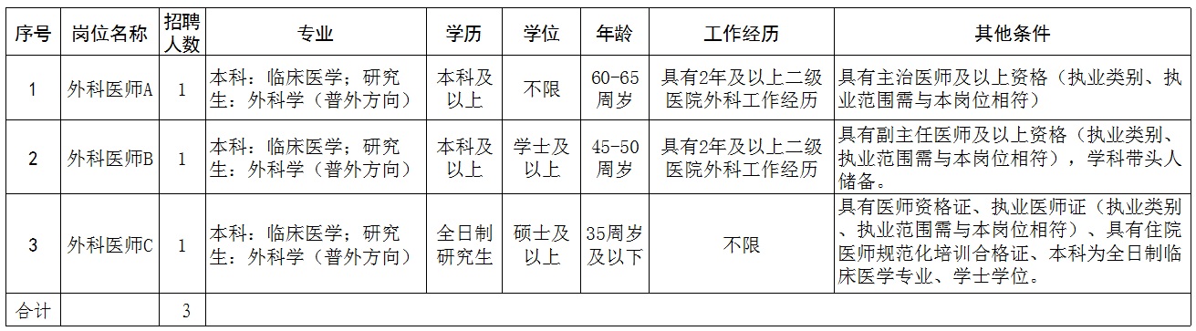 医院本次面向社会公开招聘外科医师3人,具体情况如下: