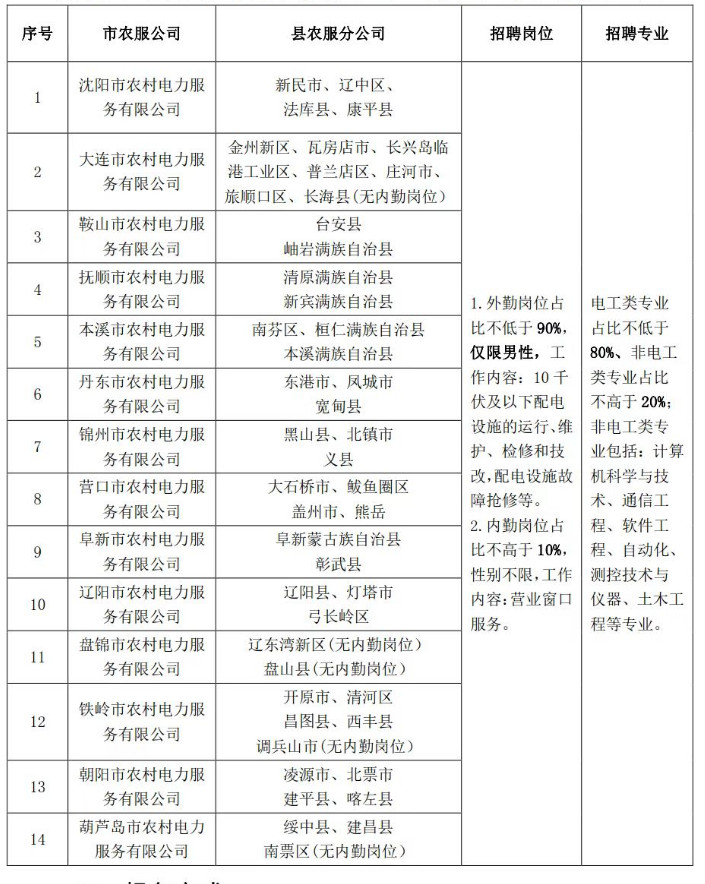 辽宁省各市农村电力服务有限公司招聘采用属地化优先原则,相关招聘条件如下: