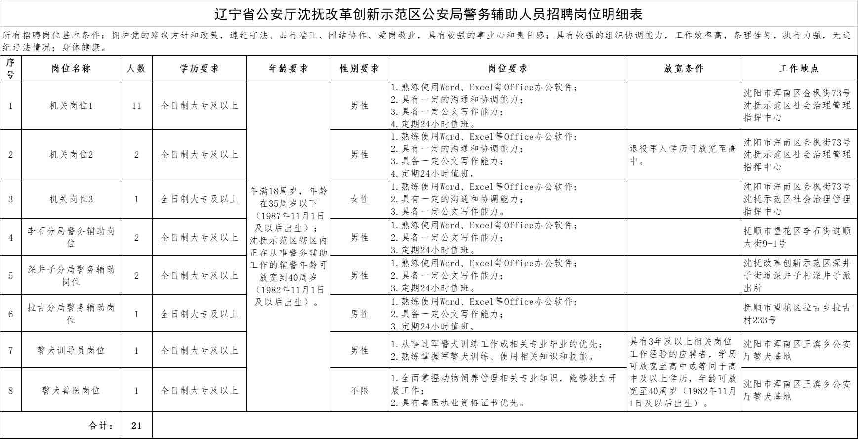 辽宁省公安厅沈抚改革创新示范区公安局共招聘警务辅助人员21人,具体详见附件《辽宁省公安厅沈抚改革创新示范区公安局警务辅助人员招聘岗位明细表》。录用人员须服从具体岗位分配,否则将取消录取资格。