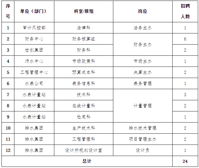 根据集团工作实际,水务集团及部分下属单位面向社会公开招聘24名员工,现将有关事项公告如下。