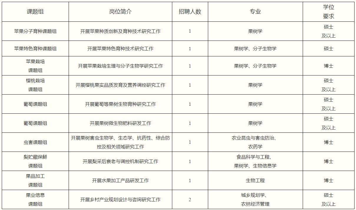 根据果树科技创新事业发展需求,我单位拟面向社会公开招聘优秀高校毕业生、留学回国人员等11名。现将有关事项公告如下: