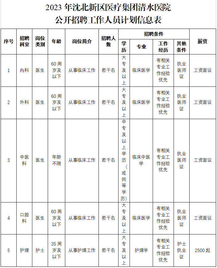 2023年沈阳市沈北新区医疗集团清水医院招聘启事