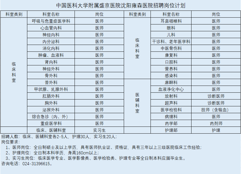 中国医科大学附属盛京医院沈阳雍森医院临床、医辅科室招聘通知