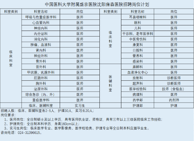 原标题:中国医科大学附属盛京医院沈阳雍森医院 临床、医辅科室2023年招聘通知